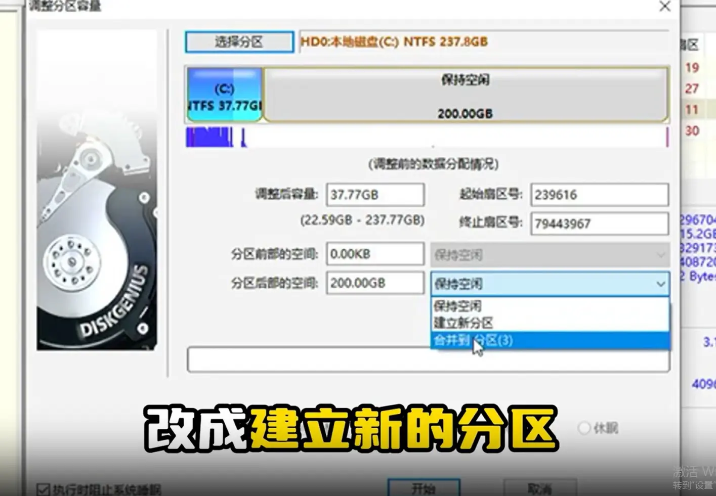 In the settings panel on the right side, change the option from “Keep Free Space” to “Create New Partition.” This tells DiskGenius to format the separated space as a usable partition.