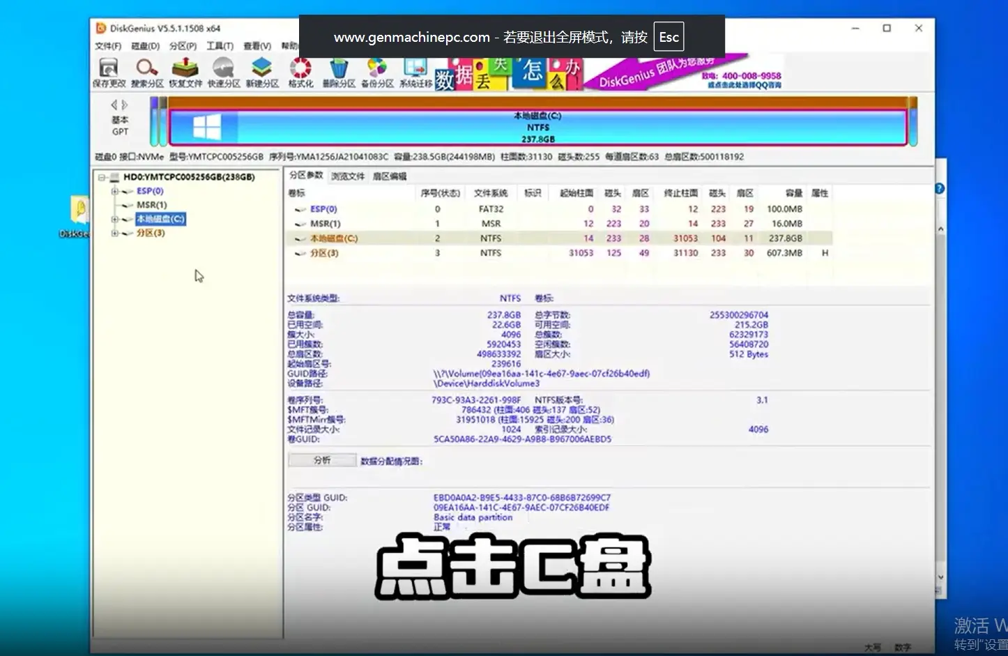 Launch DiskGenius after installation completes. The interface displays all storage devices connected to your Mini PC. Click on your C drive to select it as the target for partitioning.